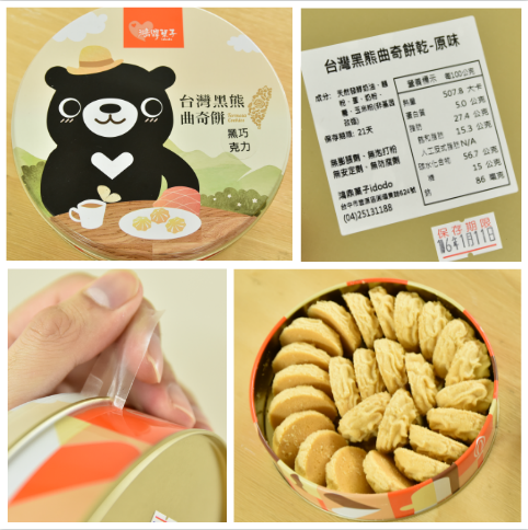 鴻鼎?子黑熊曲奇餅乾的鐵盒,盒蓋與盒身間有封膠,避免因為碰撞而散開。在盒底的部分,有詳細的產品資訊及保存有效日期。